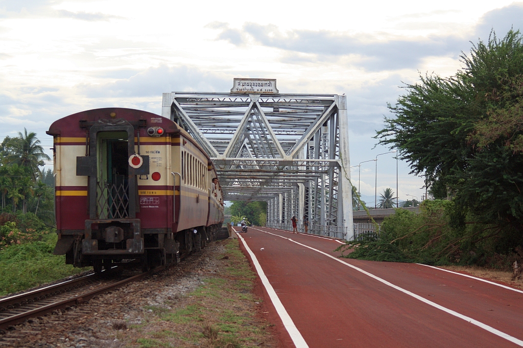 บชส. 1089 (บชส. =BTC./Bogie Third Class Carriage) am 20.Mai 2016 als letzter Wagen des RAP 174 (Nakhon Si Thammarat - Bangkok) bei der Chulachomklao Bridge über den Tapi River.