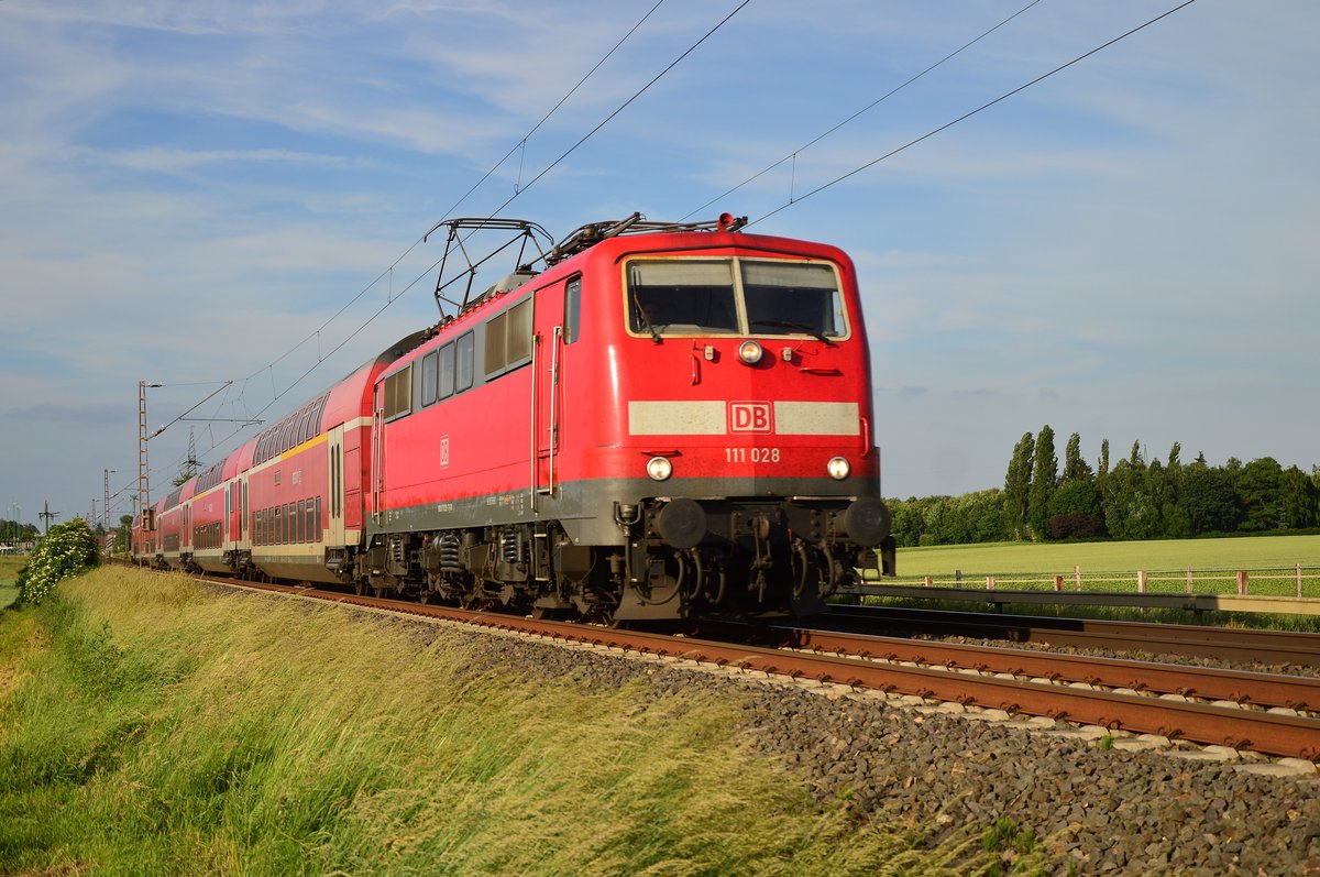 Am Mittwochabend den 8.5.2016 kommt die ex Münchenerin 111 028 mit einem RE4 nach Aachen Hbf unweit des Bü Am Chur/in der Schley vor meine Linse gefahren.