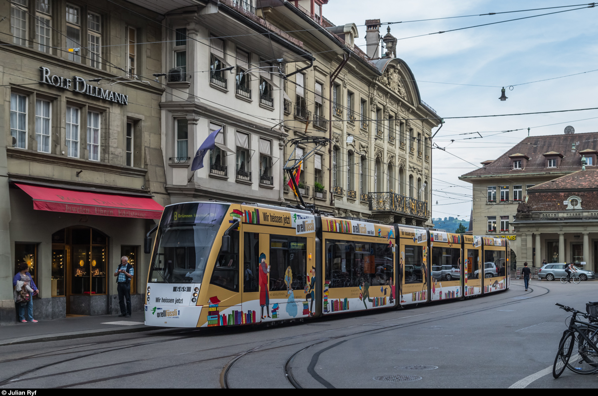 BERNMOBIL Combino XL 669 in Werbelackierung für Orell Füssli ist am 7. Juni 2016 auf der Linie 8 unterwegs beim Zytglogge.