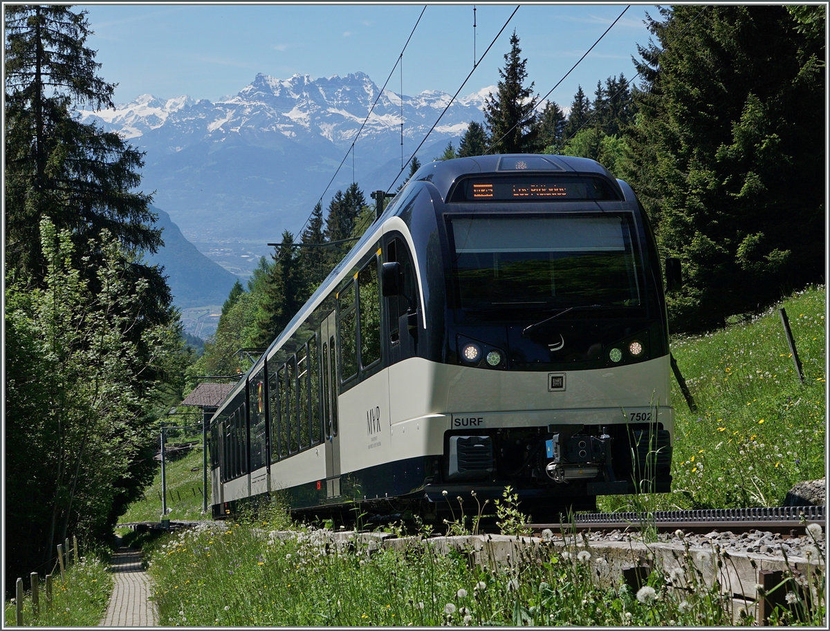 Der CEV MVR SURF GTW ABeh 2/6 7502 "Blonay" zwischen Lally und Les Pléiades.