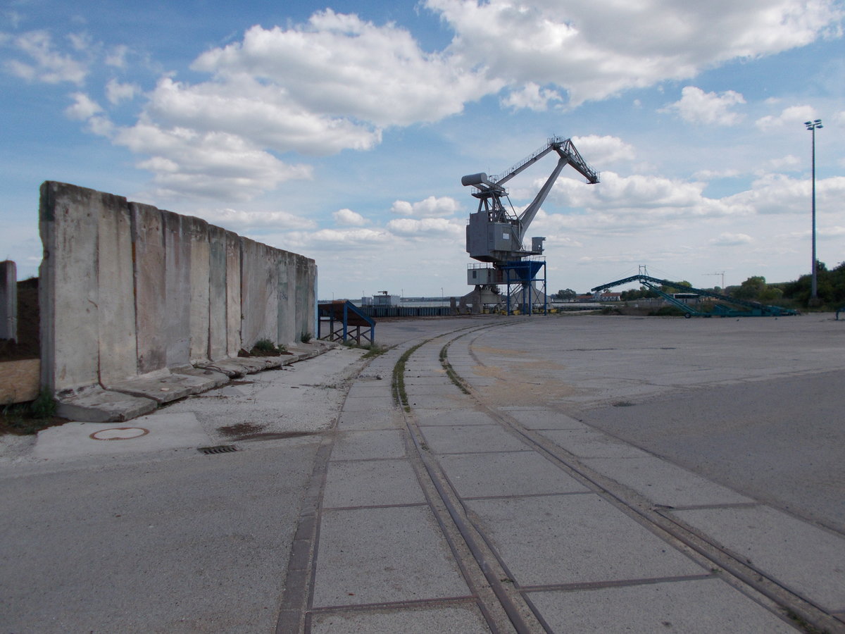Der Greifswalder Hafenanschluß Ladebow,am 17.Juni 2015,mit dem Hafengleis zum Kai.Aufnahme durch das Hafentor.