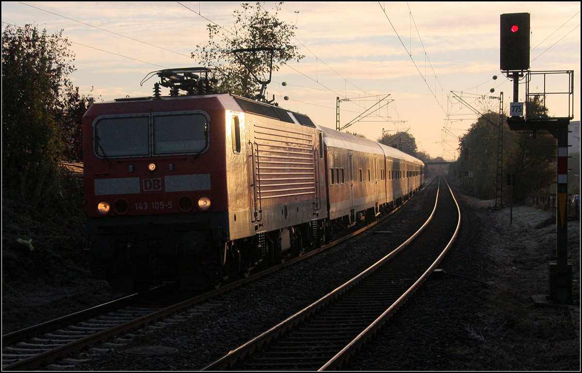 Hier ein mit einer 143 bespannter Regionalexpress bei der Vorbeifahrt in Rommelshausen.