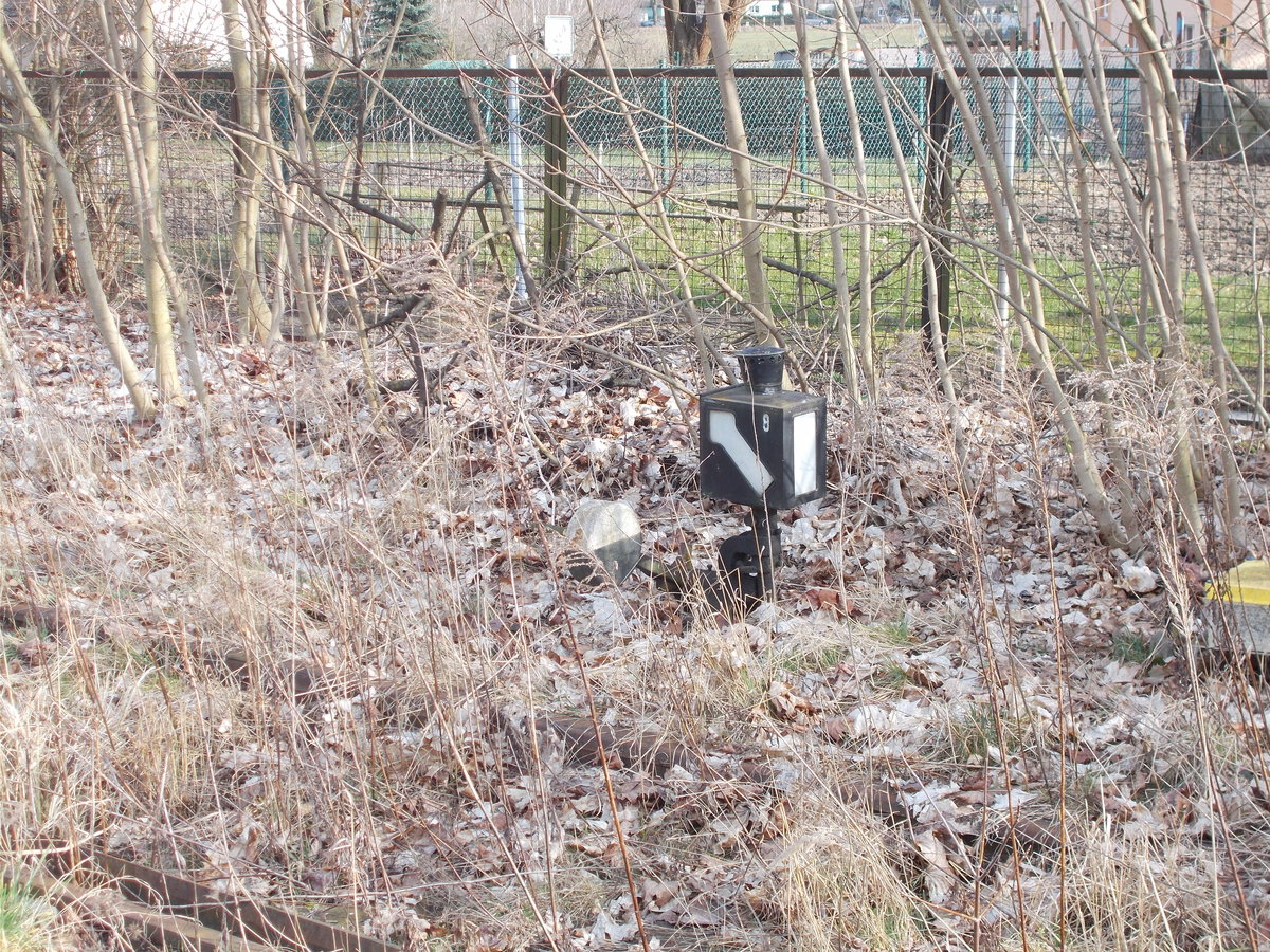 Hinter Gestrüpp versteckt eine ehemalige Handweiche in Werneuchen am 19.März 2016.