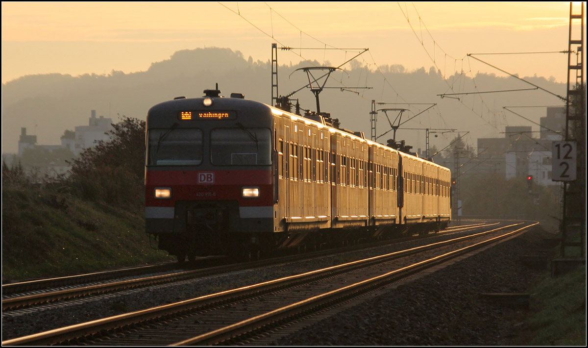 Ein S-Bahn der Baureihe 420 in Richtung Stuttgart bei Weinstadt-Endersbach auf der Remsbahn.