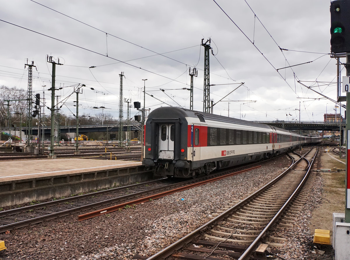 Nachschuss des vollständig aus SBB-Wagen bestehenden EC 6 (Interlaken Ost - Basel SBB - Düsseldorf Hbf - Bremen Hbf - Hamburg-Altona), bei der Ausfahrt aus Mannheim Hbf.