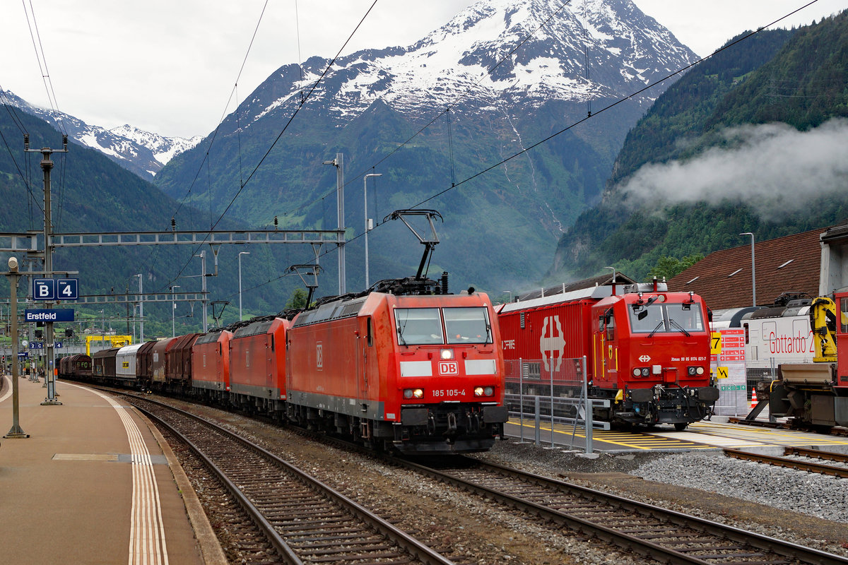 Da während den Feierlichkeiten vom 4. und 5. Juni 2016 zwischen Erstfeld und Biasca pro Stunde fünf Personenzüge in beide Richtung unterwegs waren, musste der Güterverkehr stark eingeschränkt werden. Zwei der wenigen Güterzüge wurden in Erstfeld (Dreifachtraktion DB BR 185) und Sisikon am 4. Juni 2016 fotografiert.