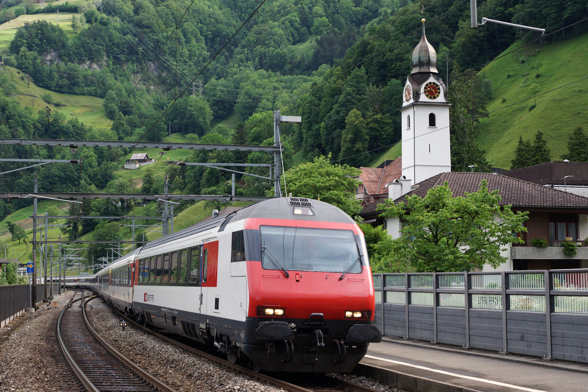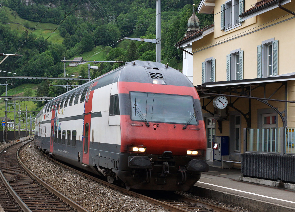 Für die Bewältigung des Grossverkehrs während den Feierlichkeiten vom 4. und 5. Juni 2016 drangen erstmals bis auf die maximale Länge verstärkte EW IV und IC 2000 Pendelzüge bis Biasca bzw. Pollegio vor. Dies "Raritäten" wurden am 4. Juni 2016 während ihrer Anreise als Extrazug bei Sisikon verewigt. Zum Fotostandort: Dieser befand sich auf dem Perron 2 korrekt hinter der weissen Linie. Beiden Aufnahmen wurde bei der Verarbeitung eine "AUSSCHNITTVERGRÖSSERUNG" verpasst!