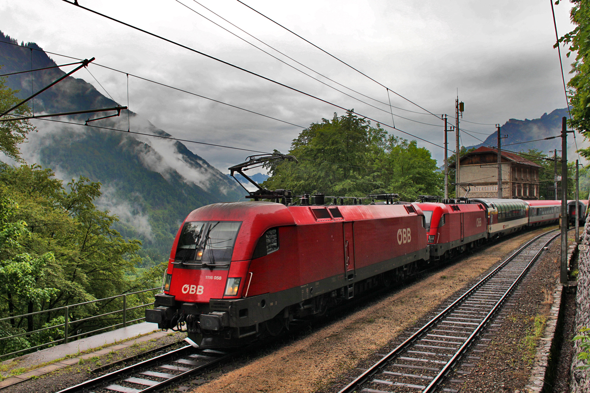 Eine 1116 der ÖBB vor einem Personenzug am 12.06.2016 bei Übersee am Chiemsee.