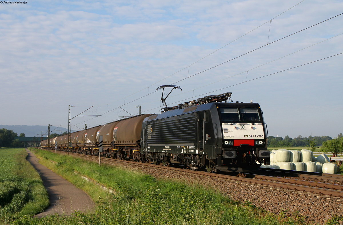 Vermittlungs-GmbH und gegenwärtig für BLS Cargo im Einsatz, führt vor einer Lok der Baureihe 186 desselben Vermieters am 10. Juni 2016 einen Güterzug über die Intschireussbrücke talwärts.