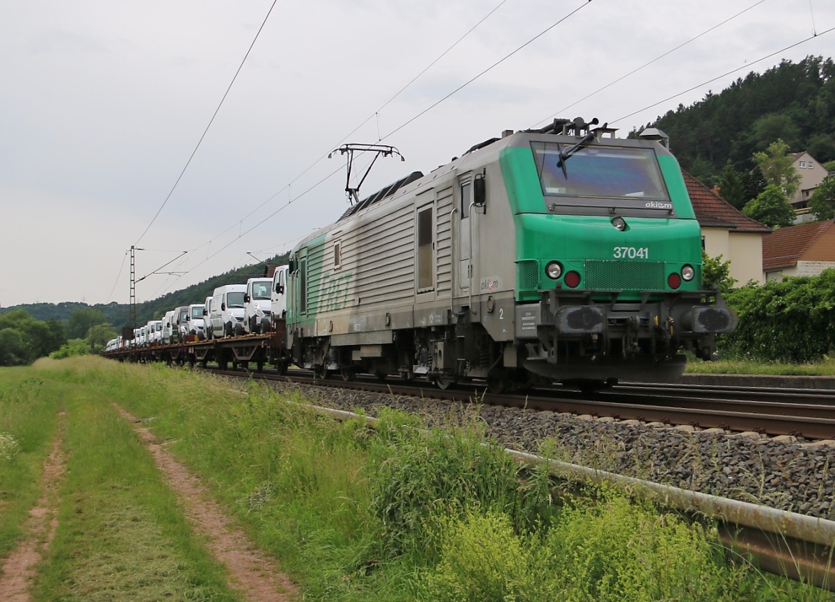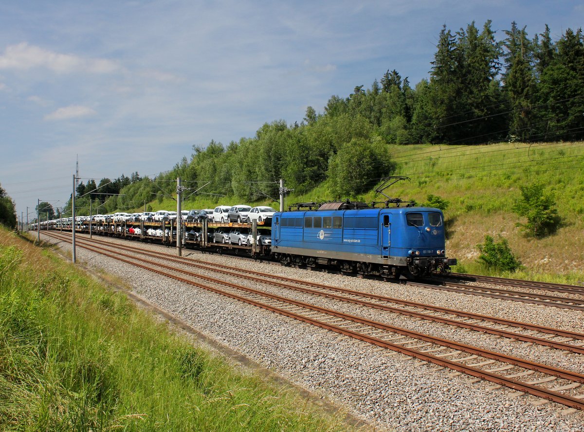 Die 151 118 mit einem Autozug am 10.06.2016 unterwegs bei Unterweilbach.