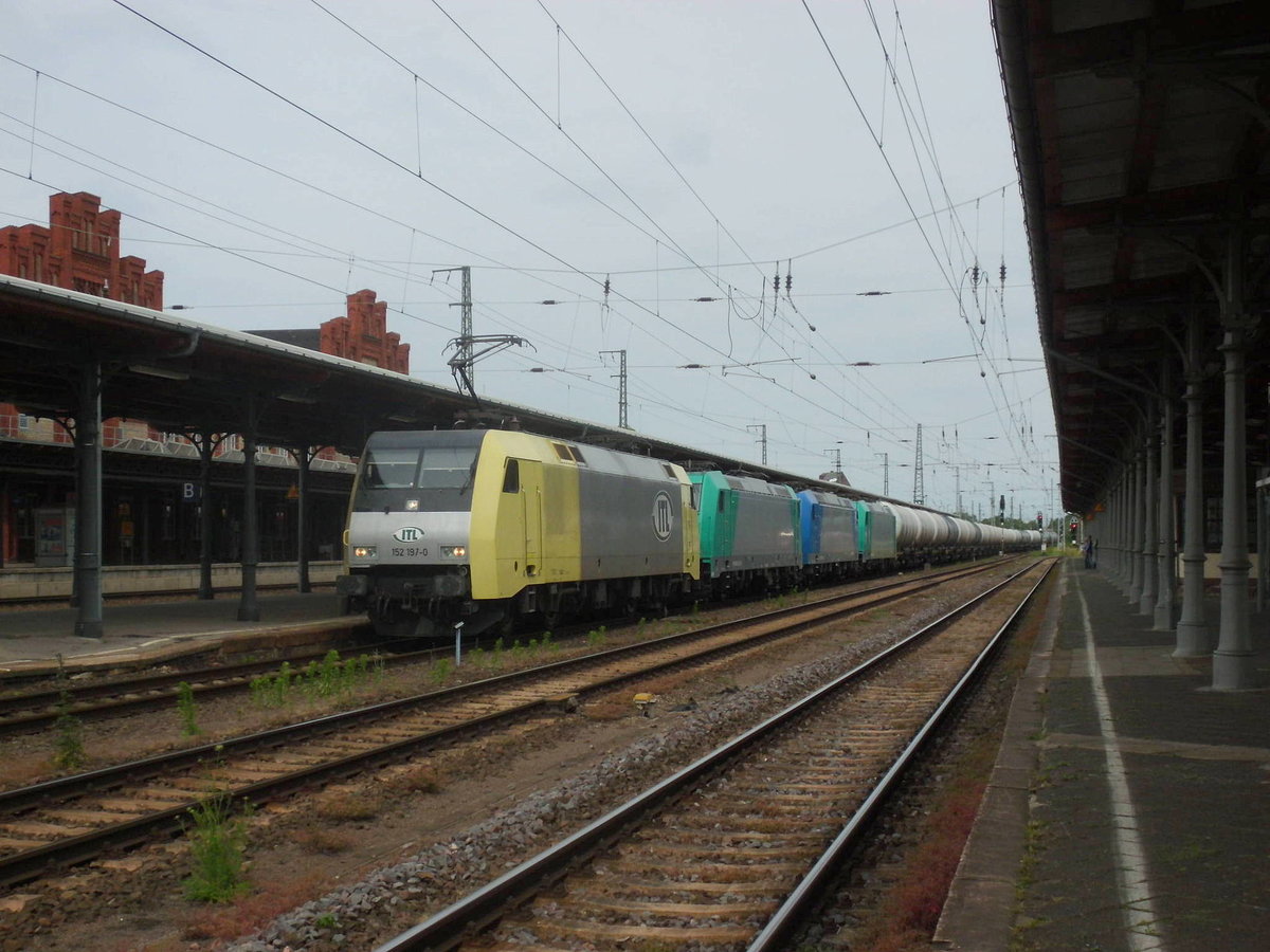 Am 12.06.2016 kam 152 197 mit 185 611,185 504,185 633 und einem Kesselzug aus Richtung Berlin nach Stendal und fuhr weiter in Richtung Uelzen.