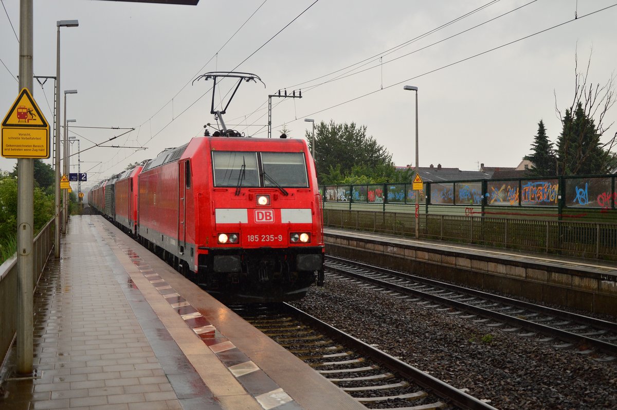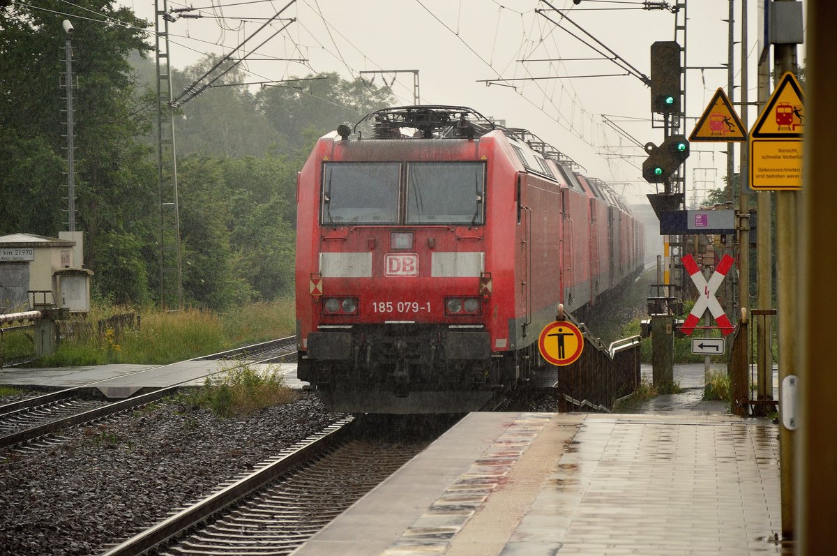 Auf dem Bahnübergang am Bahnhof Klein-Gerau ist die letzte Lok im Zug die 185 079-1 am heutigen Nachmittag im strömenden Regen von mir abgelichtet worden.