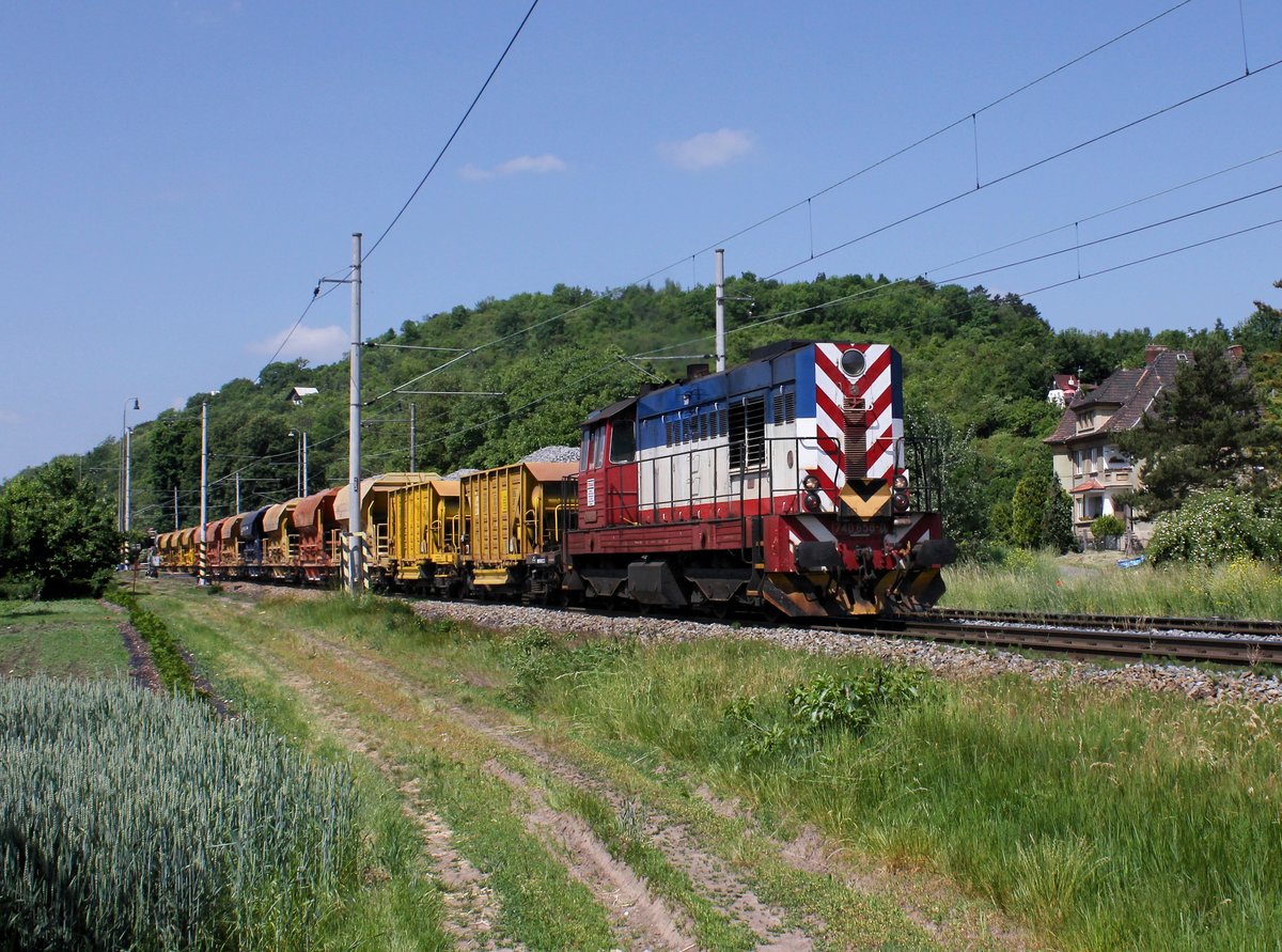 Die 740 658 mit einem Schotterzug am 04.06.2015 unterwegs bei Křešice.