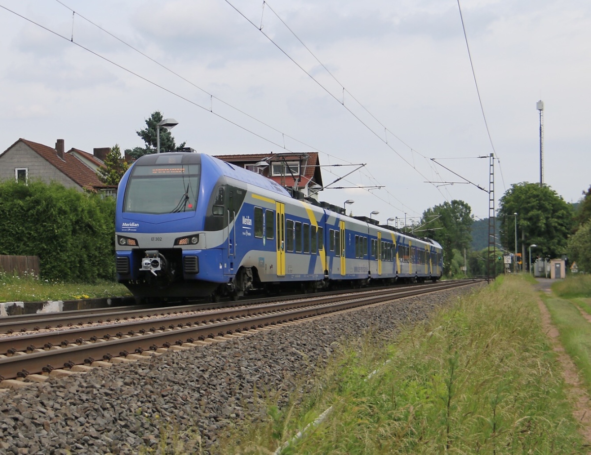 Fernab der Heimat war am 11.06.2016 der ET 103 von Meridian unterwegs. Er befuhr die KBS 610 in Richtung Süden. Aufgenommen in Ludwigsau-Friedlos.