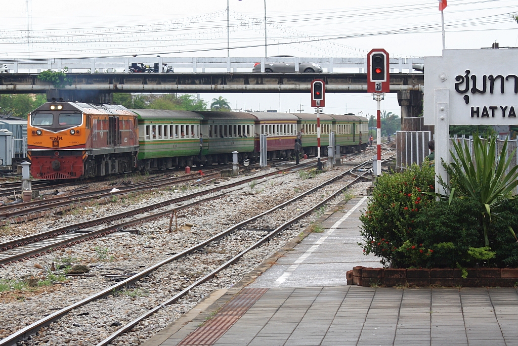 GEA 4560 (Co'Co', de, General Electric, Bj.1995) fährt am 25.Mai 2016 mit dem ORD 451 ((Nakhon Si Thammarat - Sungai Kolok) in den Bf. Hat Yai ein.