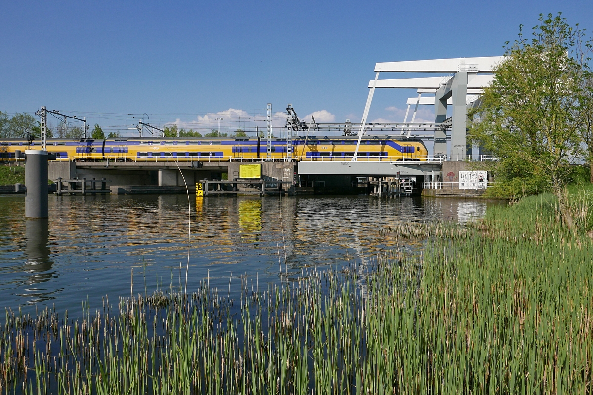 Kurz nach dem Passieren des Bahnhofs von Weesp befindet sich am 07.05.2016 ein Triebzug der Baureihe VIRM "Regiorunner" auf der Fahrt von Nijmegen nach Den Helder.