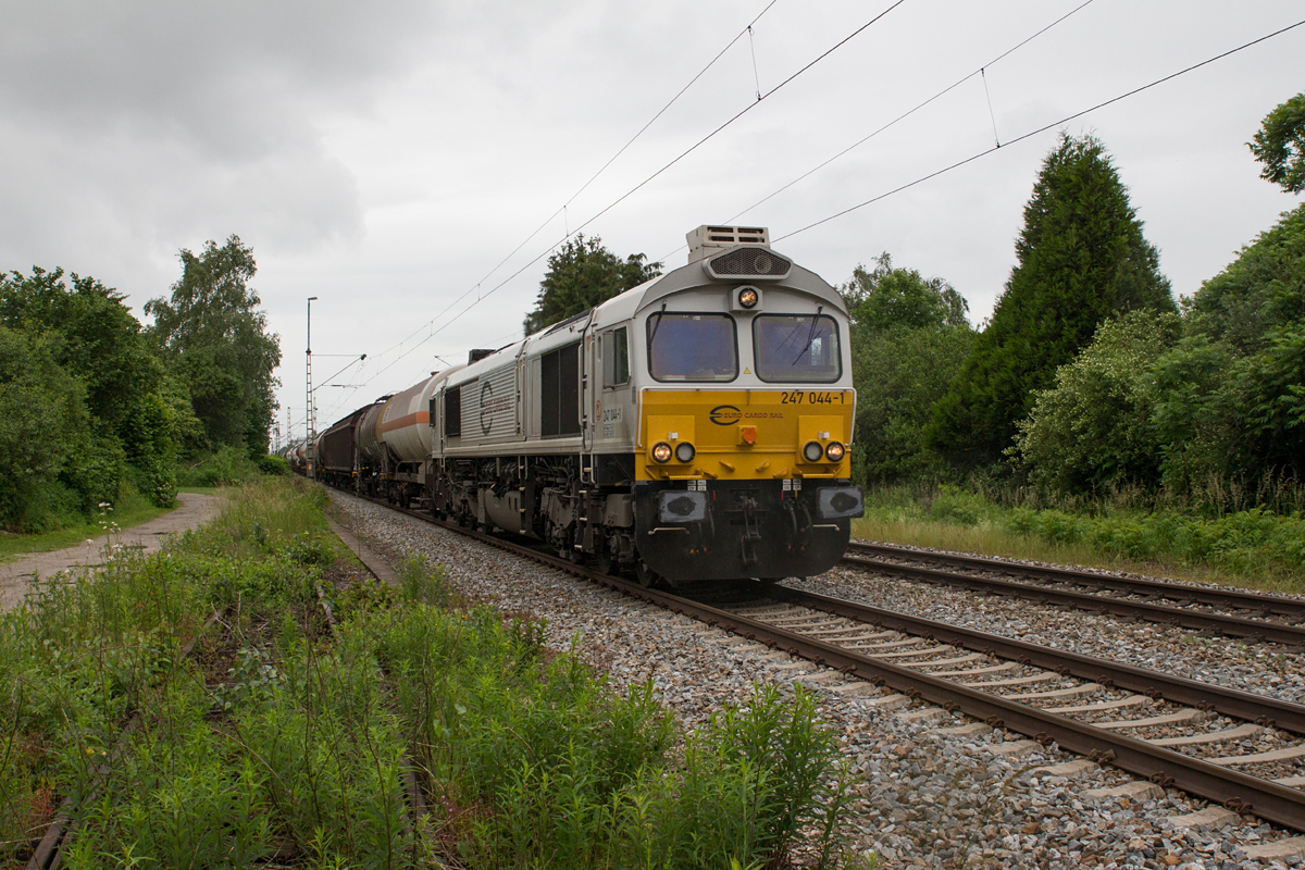 Typisch Sonntag, Typisch schlechtes Wetter, Typisch 247 044-1 vor dem gemischten Güterzug nach Mühldorf am Vormittag. (Poing, 12.06.16)