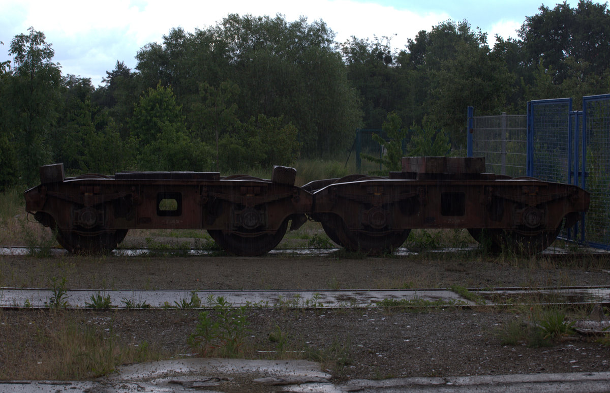 Vor den großen Werkhallen, welche über eine Schiebebühne zu erreichen sind, finden sich zwei Drehgestelle. 12.06.2016 14:49 Uhr. Brieske bei Snftenberg.