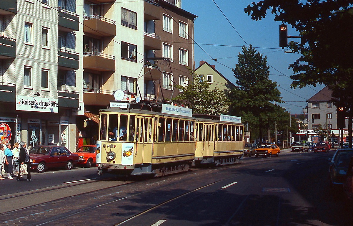 Als Zubringer zur Bundesgartenschau 1987 in Düsseldorf wurde auch der älteste Rheinbahn-Museumswagen, der "Fünffensterwagen" 587 von 1921, eingesetzt, hier an der Haltestelle Luisenstraße