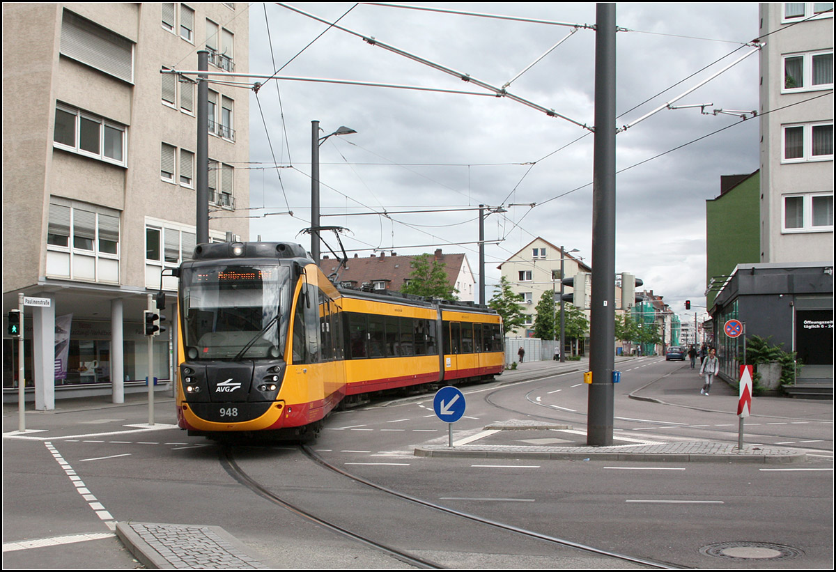 Vom Autoverkehr belastet ist die Paulinenstraße in Heilbronn. Obwohl es sich um eine Bundesstraße handelt, hat man doch Platz gefunden, hier eine Stadtbahntrasse unterzubringen. Auffällig gestaltet sind die Oberleitungsmasten.