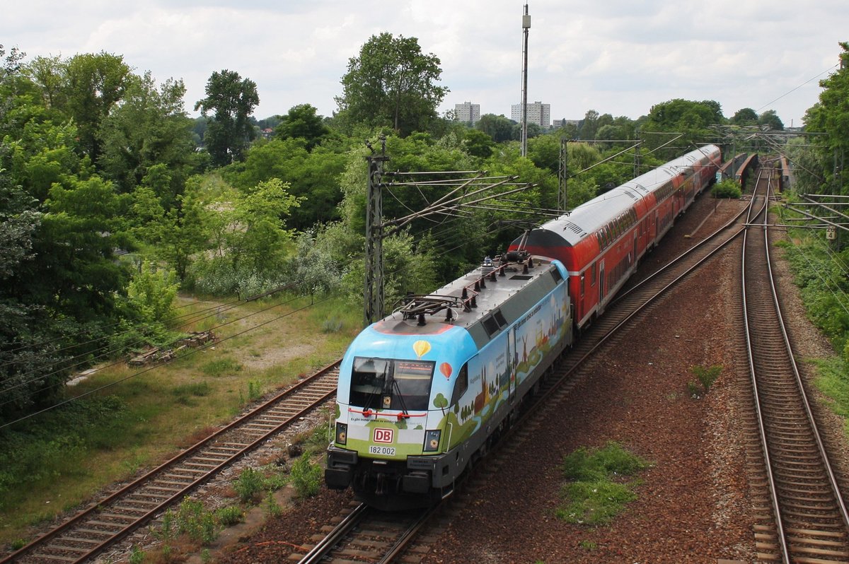 182 002 ist am 19.6.2016 mit einem RE1 (RE18183) von Brandenburg Hauptbahnhof nach Berlin Ostbahnhof unterwegs. Hier bei den Havelbrücken in Potsdam zwischen Hauptbahnhof und Charlottenhof.