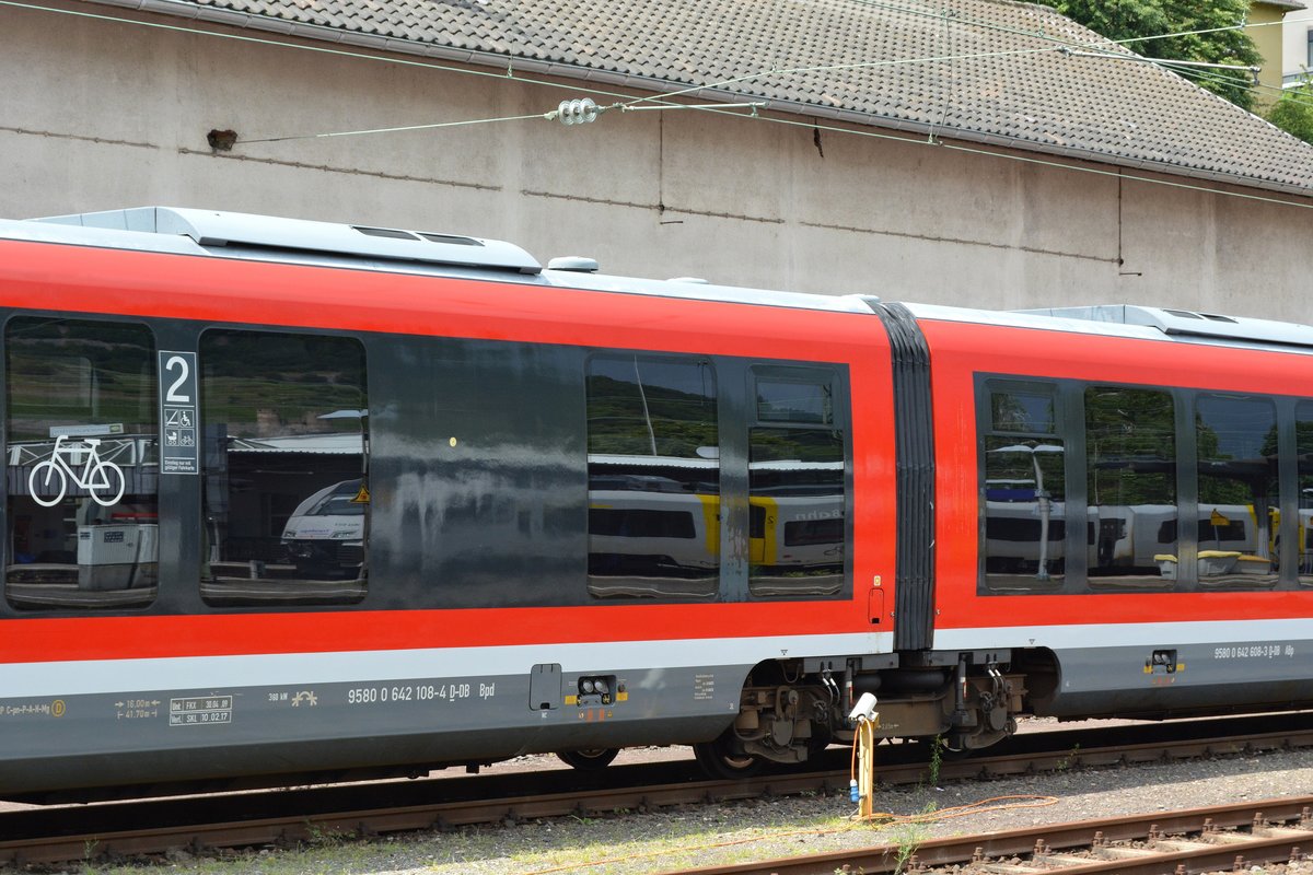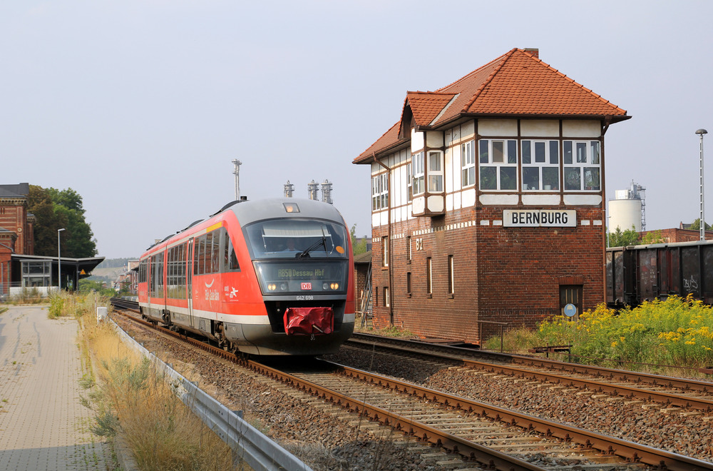 642 698 verlässt auf seinem Weg nach Dessau den Bahnhof von Bernburg an der Saale. Aufnahmedatum: 30.08.2013