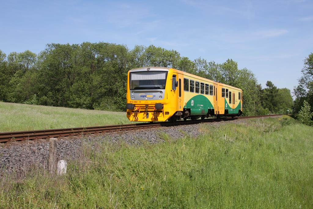 Am 22.05.2016 kam mir um 10.38 Uhr Regionova Triebwagen 814094 kurz vor Erreichen des Bahnhof Tremesna vor die Kamera.