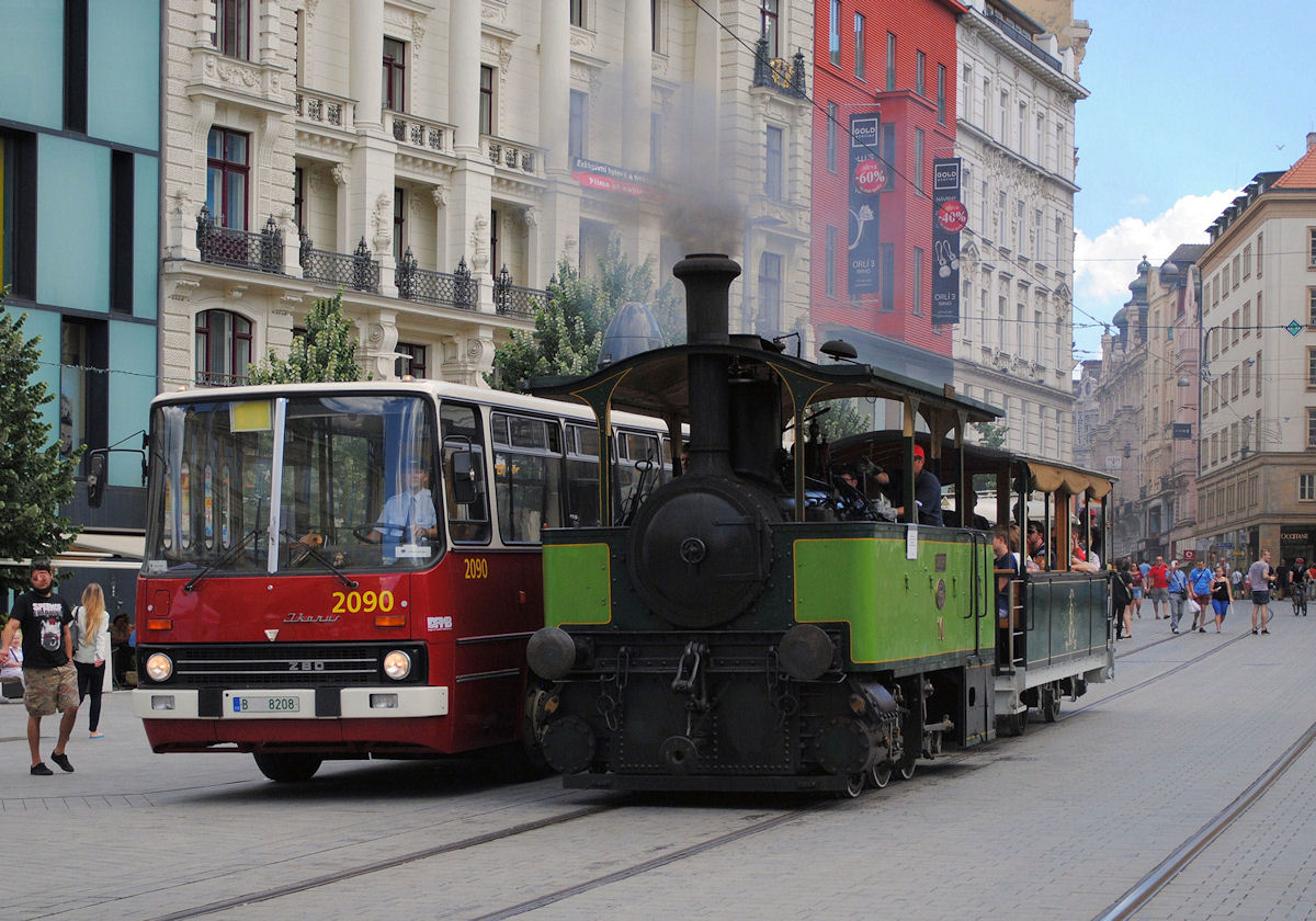 Anläßlich eines Stadtfestes fanden am 18.06.2016 umfangreiche Oldtimerfahrten mit Straßenbahnen, Bussen und Oberleitungsbussen statt. Zu den Höhepunkten zählte sicher der Einsatz der Dampftramwaylok  Caroline  aus dem Jahr 1889, die am Nam. Svobody gerade am knapp hundert Jahre jüngeren Nostalgiebus 2090 der Reihe Ikarus 280 vorbeifuhr.