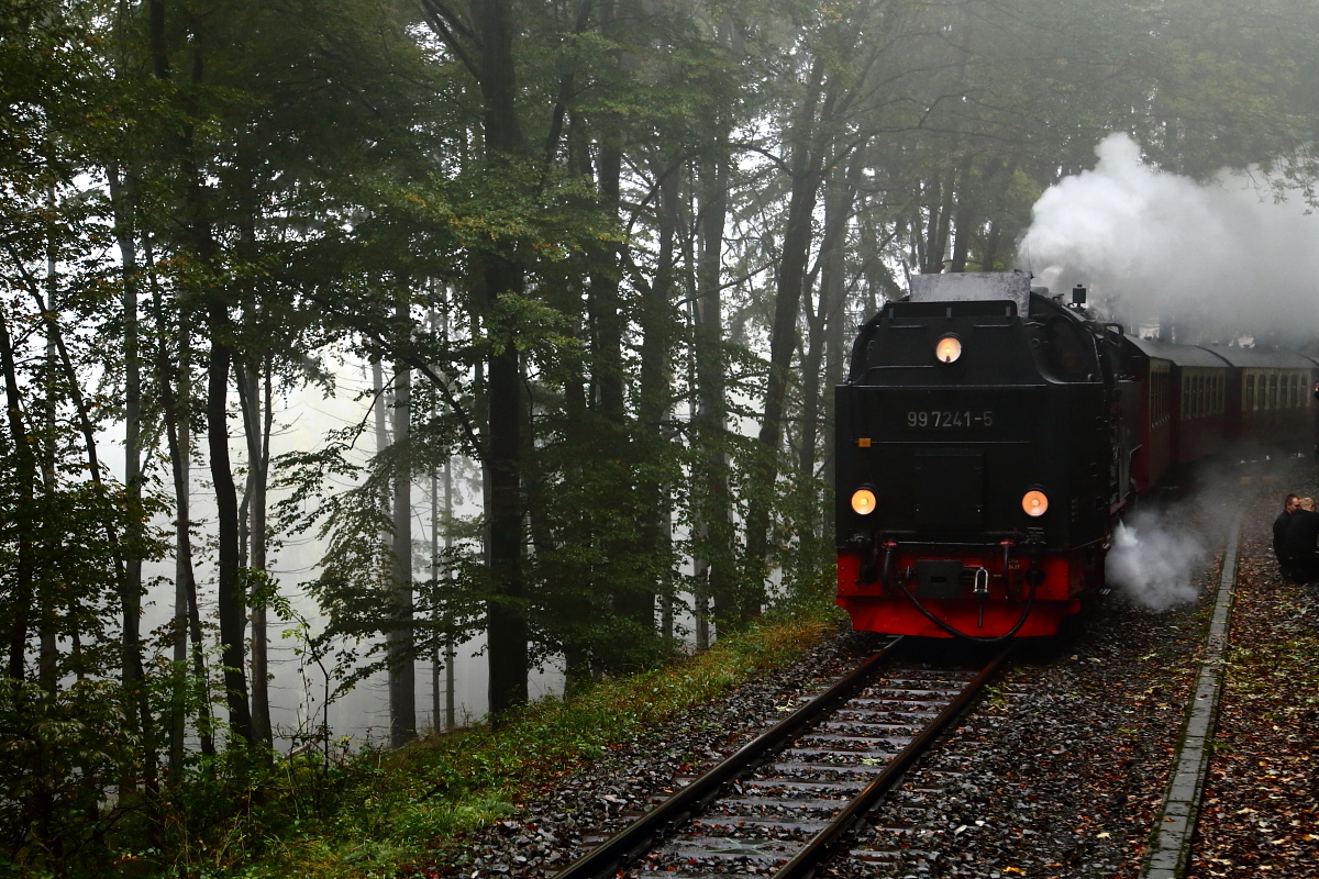 Soeben ist 99 6001 am 16.10.2015 mit ihrem IG HSB-Sonderzug, bei unfreundlichem Nebel- und Nieselregenwetter, im Bahnhof Drei Annen Hohne eingelaufen. Wenn man genau hinschaut, ist im Lokführerhaus der Widerschein aus der Feuerbüchse zu sehen.