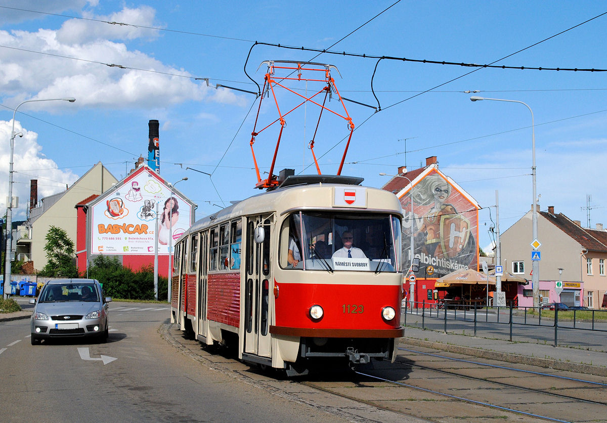 Der K2 1123, der letztes Jahr noch im Planverkehr fuhr, wurde in liebevoller Detailarbeit wieder in den Zustand seiner Lieferung im Jahr 1983 zurückversetzt. Am 18.06.2016 drehte er im Rahmen eines Stadtfestes seine Runden zwischen dem Nam. Svobody im Zentrum und der im Nordosten gelegenen Endstelle Obrany Babicka und konnte am Tomkovo nam. festgehalten werden.
