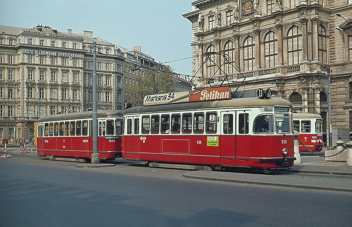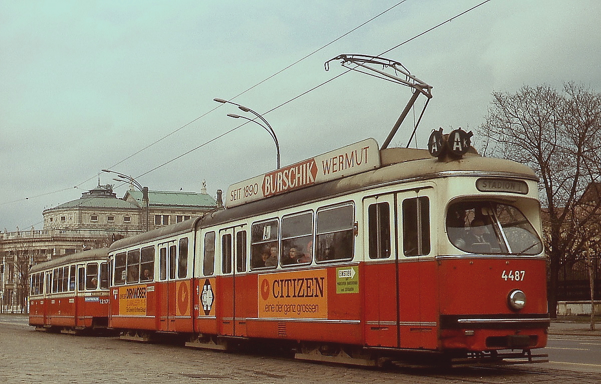 E1 4487 und Beiwagen c1 1217 sind als Linie Ak Anfang April 1974 auf dem Ring in Richtung Stadion unterwegs, im Hintergrund das Burgtheater