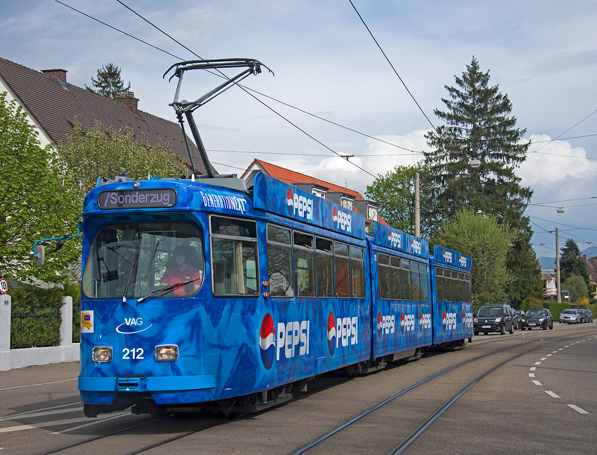Freiburg GT8K 212 wirbt für Pepsi und ist noch immer fleißig unterwegs, hier als Fußballeinschub aufenommen bei der Rämerhof, 22.04.2016.