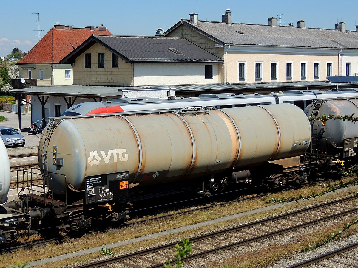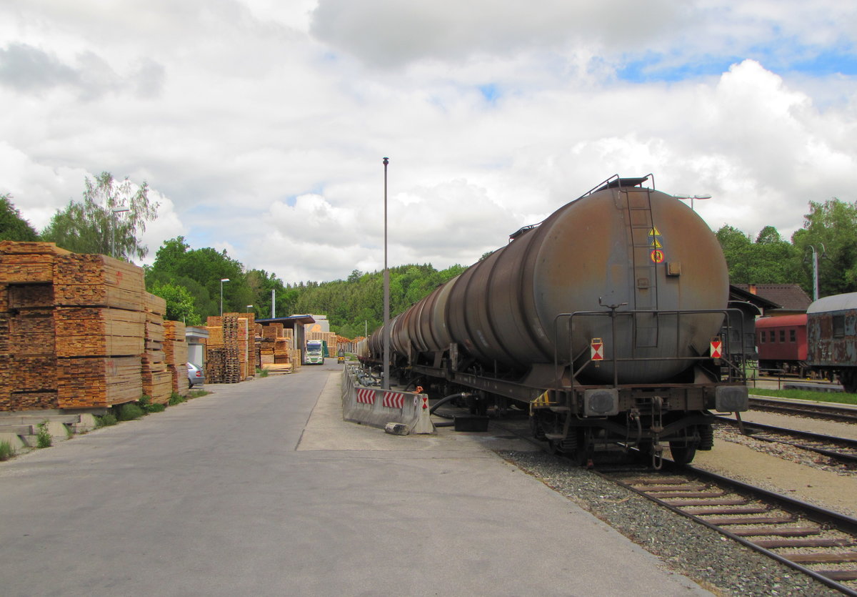 Holz- und Kesselwagen am 01.06.2016 im Bahnhof von Zwettl.
