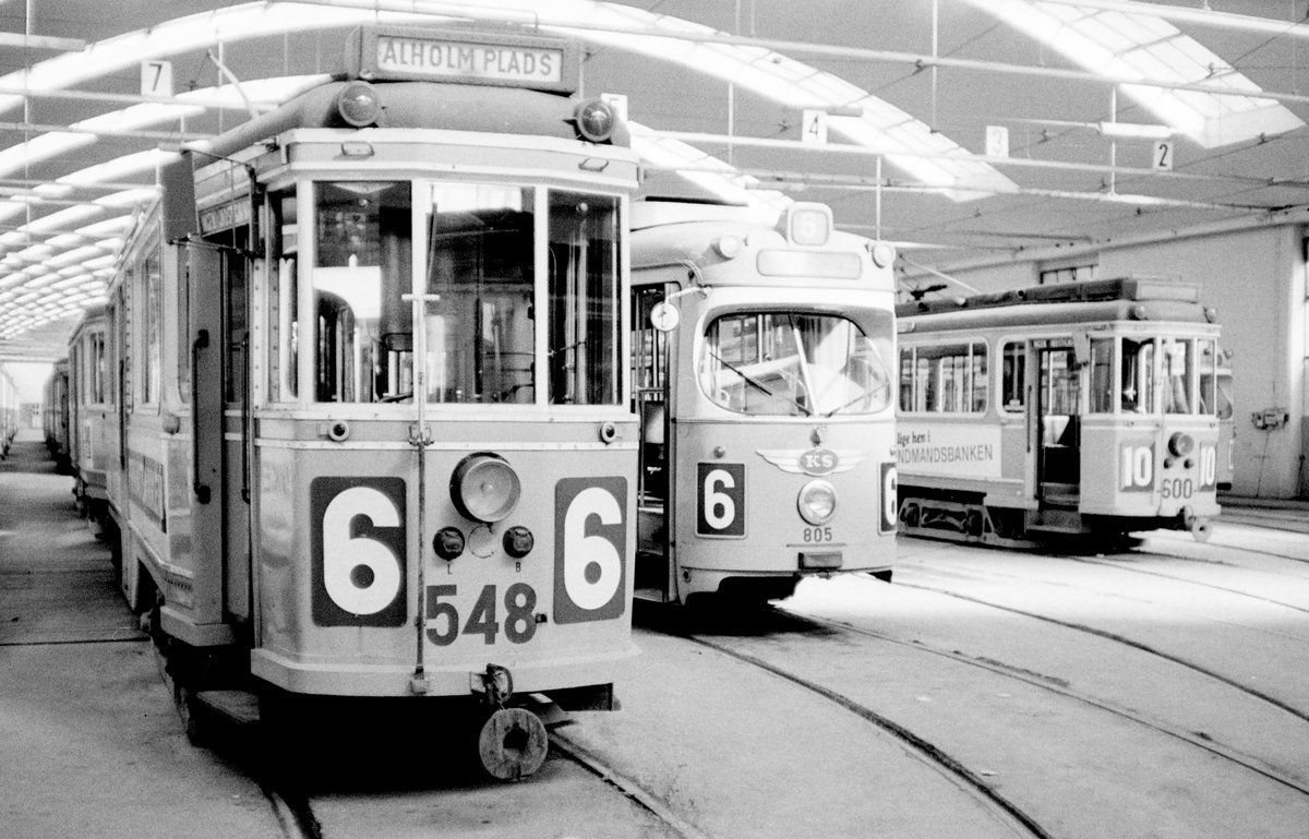 København / Kopenhagen Københavns Sporveje im April 1968: Im Betriebsbahnhof Valby halten u.a. der Tw 548 und der DÜWAG-GT6 805 als SL 6 samt dem Tw 600 als SL 10. - Scan von einem S/W-Negativ. Film: Ilford FP 3.