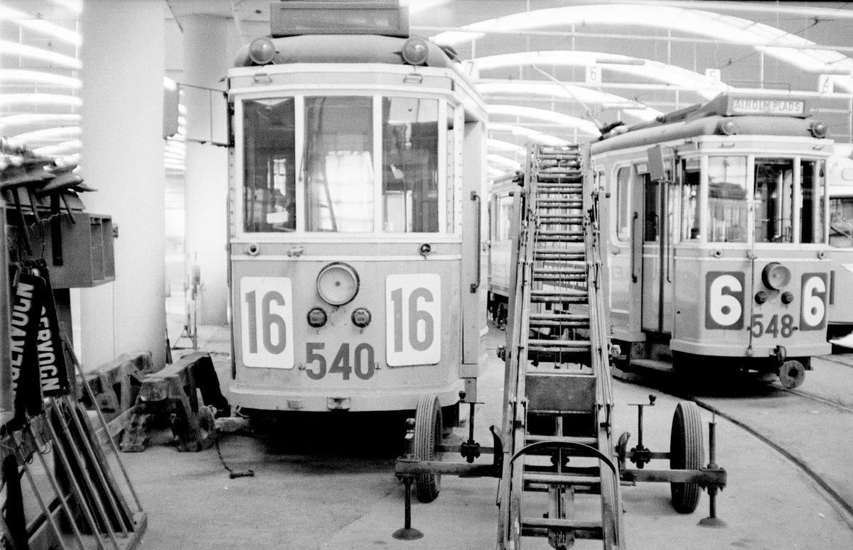 København / Kopenhagen Københavns Sporveje Betriebsbahnhof Valby im April 1968: Tw 540 als SL 16 und Tw 548 als SL 6.
