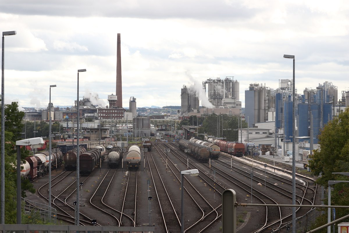 Kesselwagen im Godorfer Hafen am 07.10.2015. Im Hintergrund die Chemieanlagen in Wesseling.