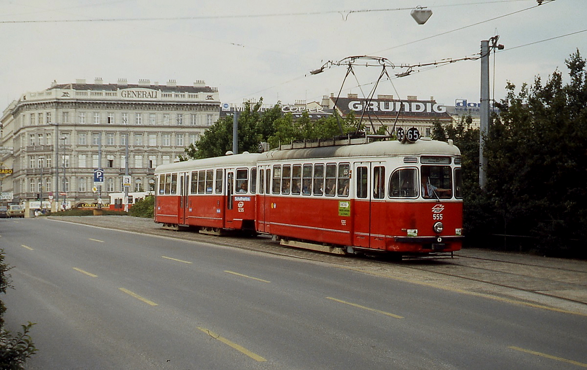 Mit dem vierachsigen Beiwagen c3 1235 ist der L4 555 im Juni 1987 am Karlsplatz auf der Linie 65 unterwegs