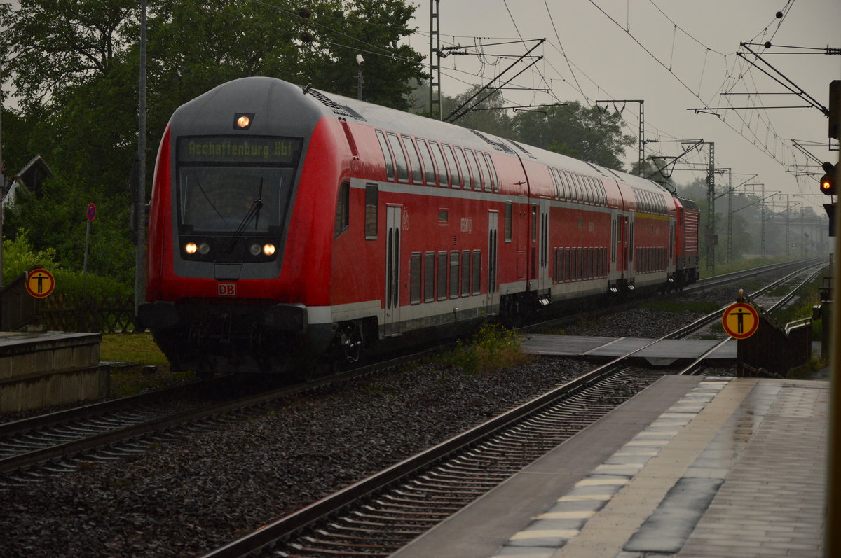 Steuerwagen voraus kommt in Klein-Gerau ein RB in den Bahnhof gerollt. Bei dem Regen freut sich jeder Fahrgast auf den schnellen Einstieg. 12.6.2016