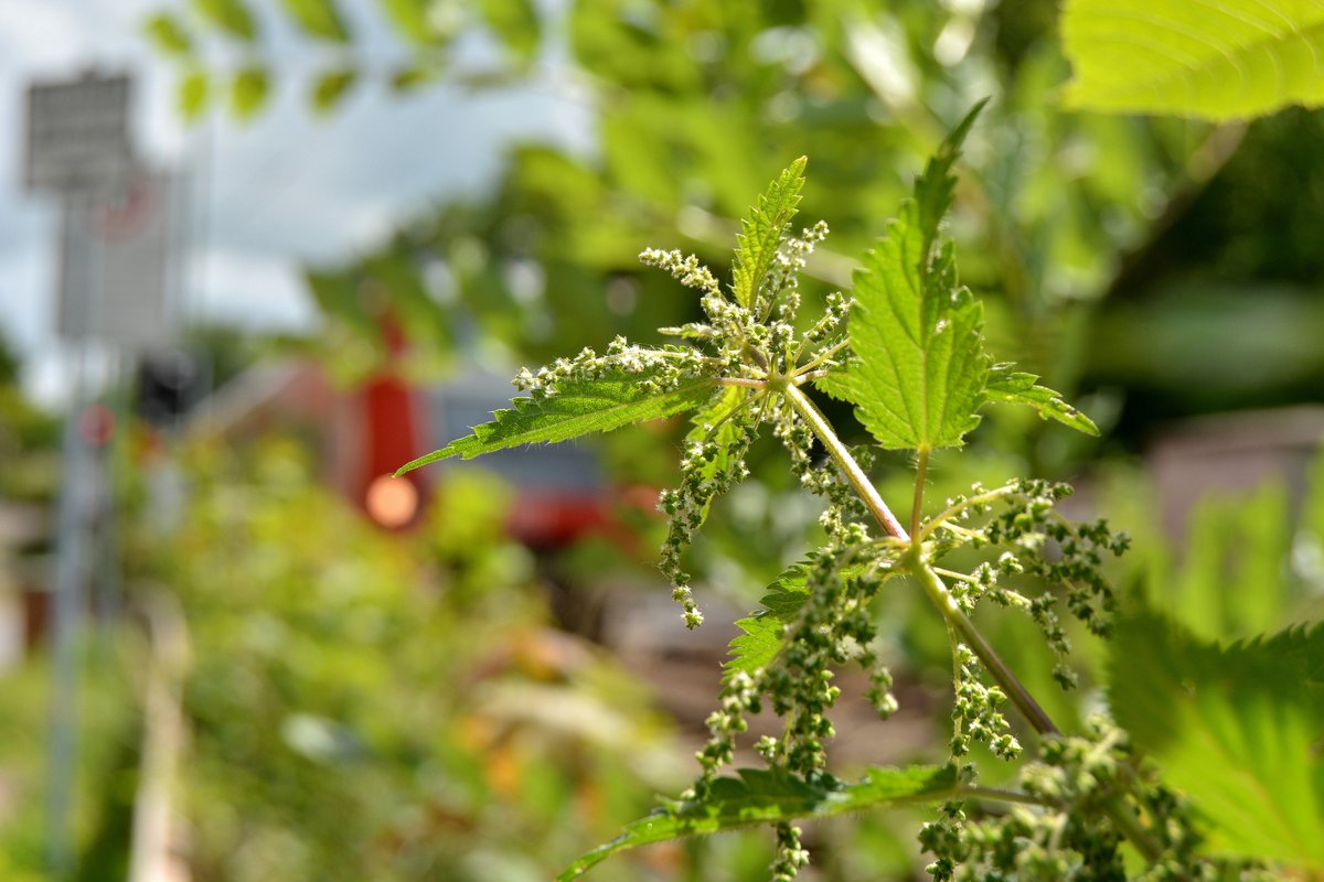 Blühendes Arragement und Strassenbahn am 17.06.2016 am Münchner Karolinenplatz.