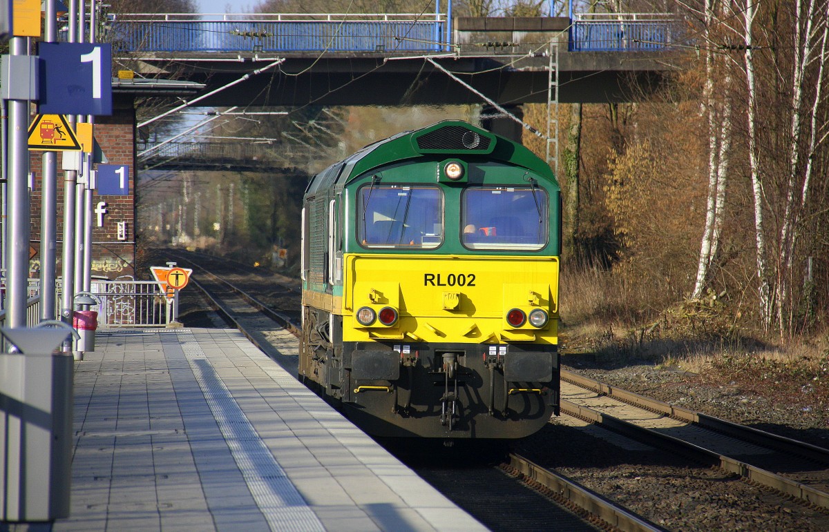 Die DE76 von RheinCargo zog am 10.3.16 einen Kesselzug durch Grevenbroich. Ziel des Zuges ist das Kraftwerk Frimmersdorf.