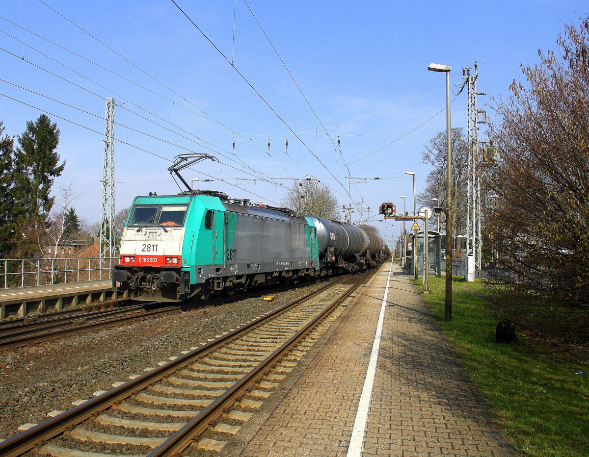 Die Cobra 2811 kommt als Umleiter die Kohlscheider-Rampe auf dem falschen Gleis hoch aus Richtung Neuss,Herzogenrath mit einem lagen Ölleerzug aus Basel-SBB(CH) nach Antwerpen-Petrol(B) und fährt durch Kohlscheid in Richtung Richterich,Laurensberg,Aachen-West.