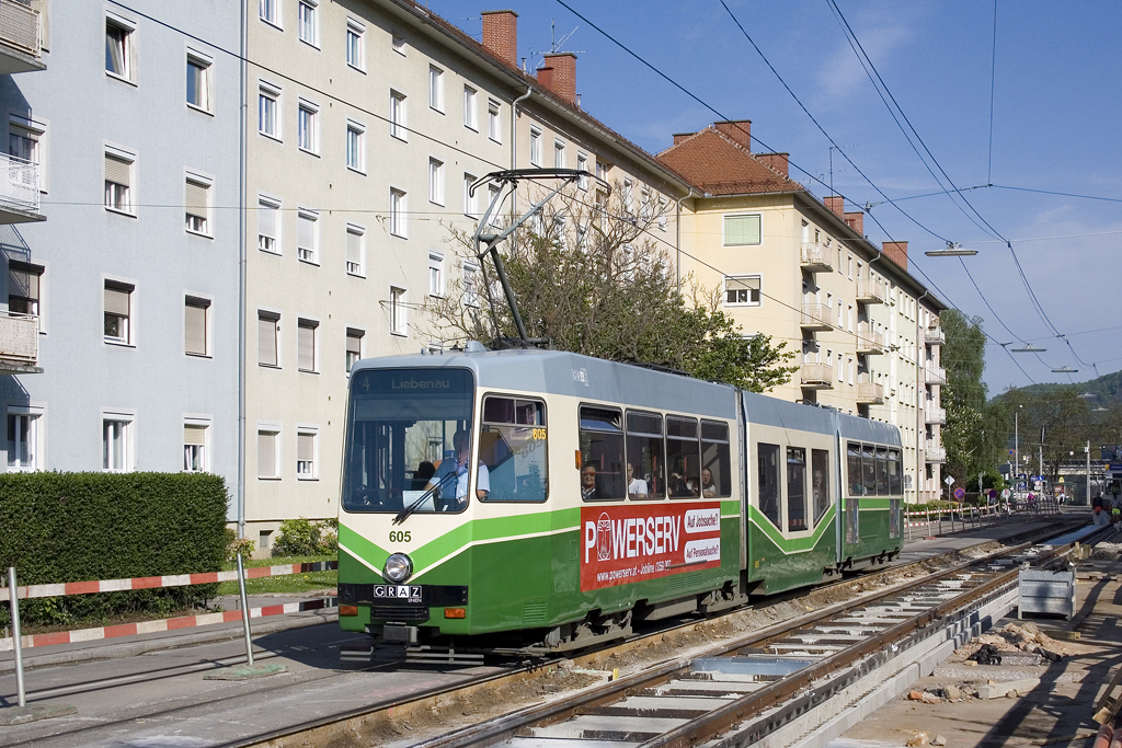 Am 2. Mai 2012 ist TW 605 auf der Linie 4 unterwegs und fährt hier durch die Theodor-Körnerstraße.