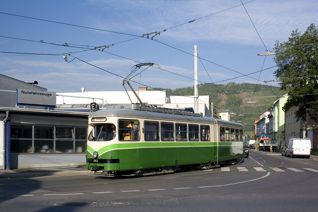 Am 28. Juni 2012 fährt TW 293 als Linie E in der Georgigasse in Richtung Remise Steyrergasse.