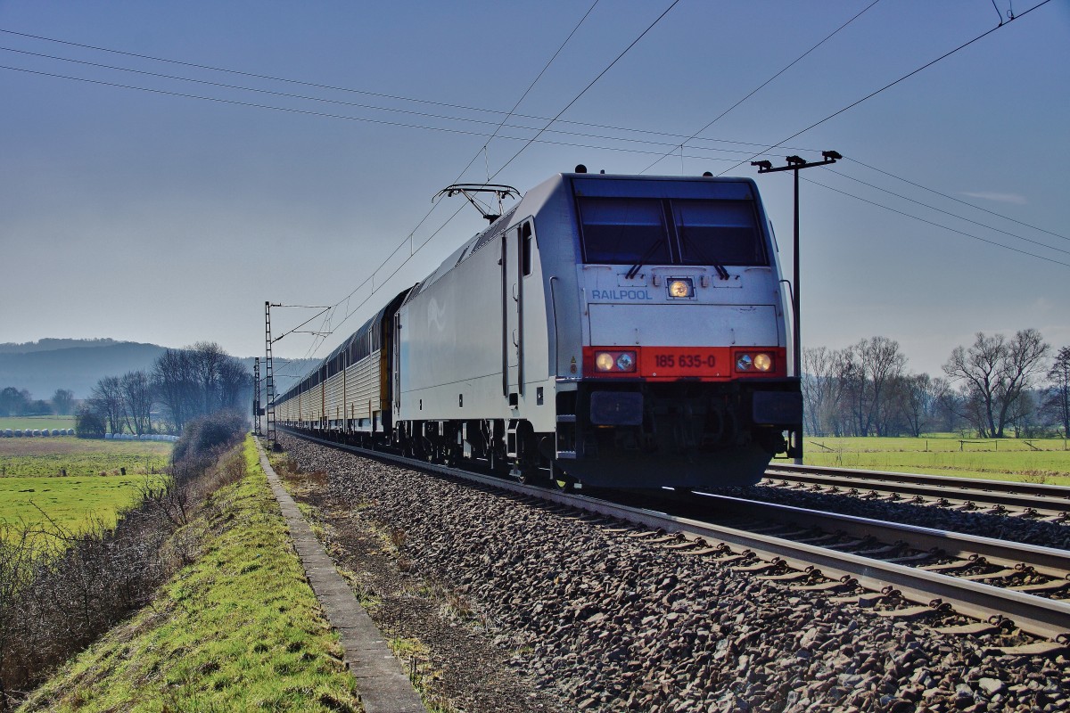 185 635-0 von Railpool abgelichtet mit einen Altmann-Autozug der in Richtung Norden unterwegs ist gesehen bei Hünfeld am 09.03.16.