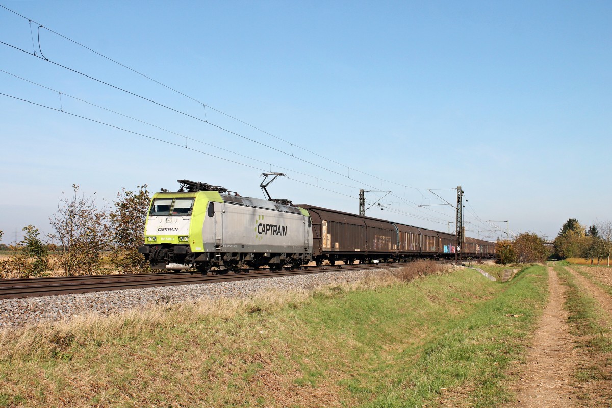 Am 31.10.2014 fuhr 185 577-4, welche zu diesem Zeitpunkt noch für Crossrail fuhr, mit einem Containerzug (Italien - Antwerpen) bei Hügelheim in Richtung Freiburg. Die 185 577-4 bespannte den zug bis nach Aachen West, wo sie den zug an eine Class 66 von Crossrail abgegeben hat.