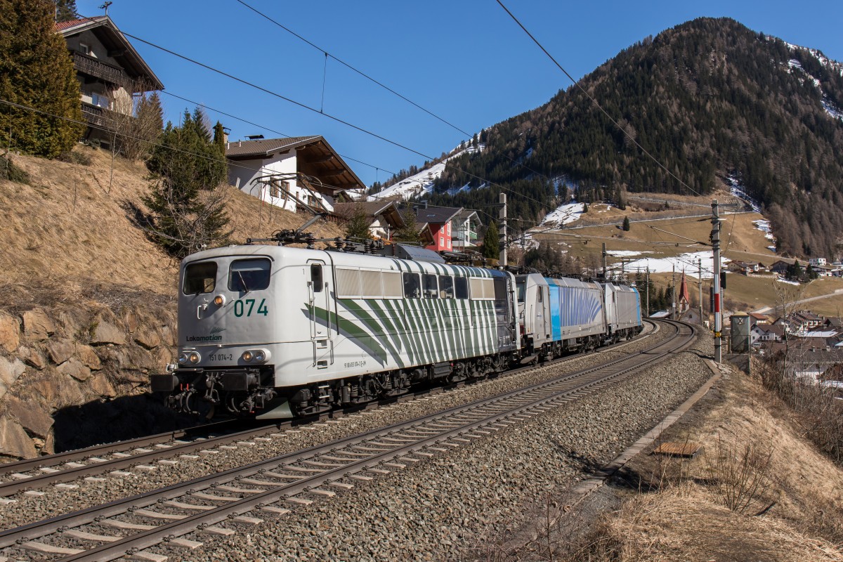 151 074, 186 102 und 186 290 von Lokomotion fahren am 19. März durch St. Jodok in Richtung Kufstein.
