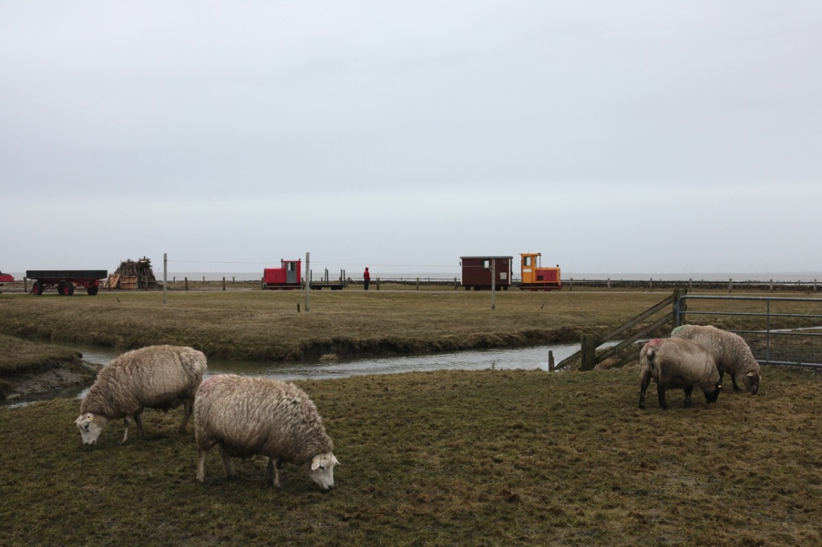Alltag auf Nordstrandischmoor, im Vordergrund die weidenden Schafe, dahinter der Priel und das Abstellgleis unterhalb der Neuwarft mit Schöme 2570 + Wagen und Schöma 5540 + Aufenthaltswagen am 21.02.2016.