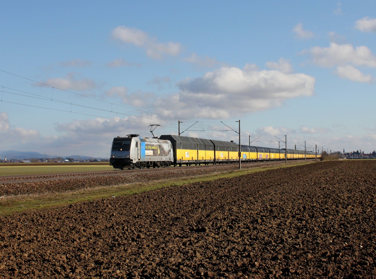 Mit einem Auto-Walther-Zug gen Köln ist hier die DB 185 296-1 bei Gubberath. 19.3.2016