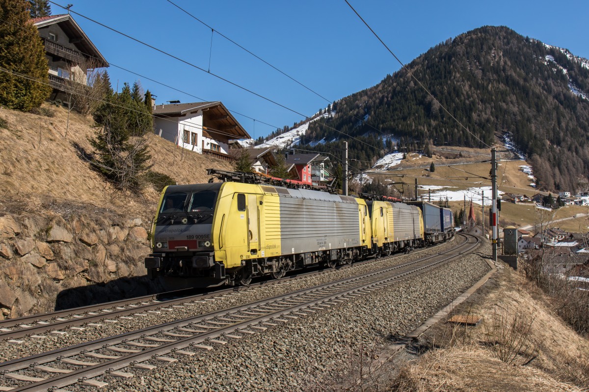 Ein gelbes Doppel alias 189 909 und 189 995 fahren mit einem KLV am 19. März 2016 den Brenner hinab in Richtung Kufstein.