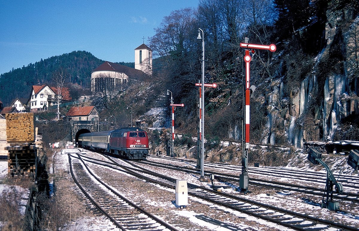 140692 hatte am 11.3.1994 einen Kokszug am Haken und erreichte hier auf der Rollbahn nach Norden fahrend den Ortsrand von Hasbergen.